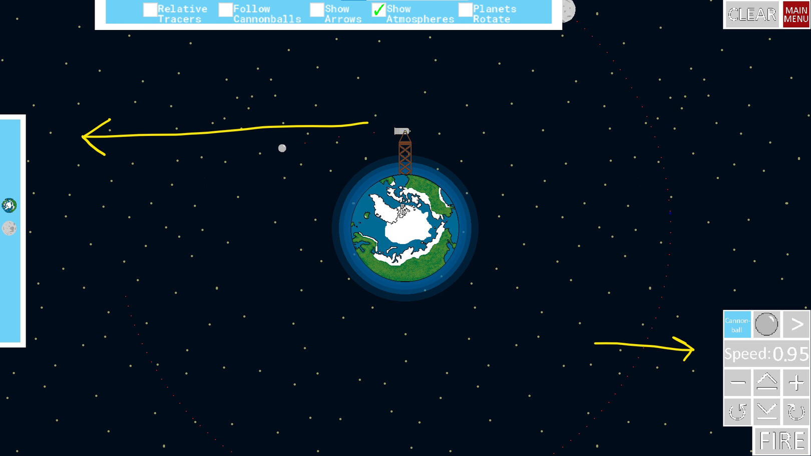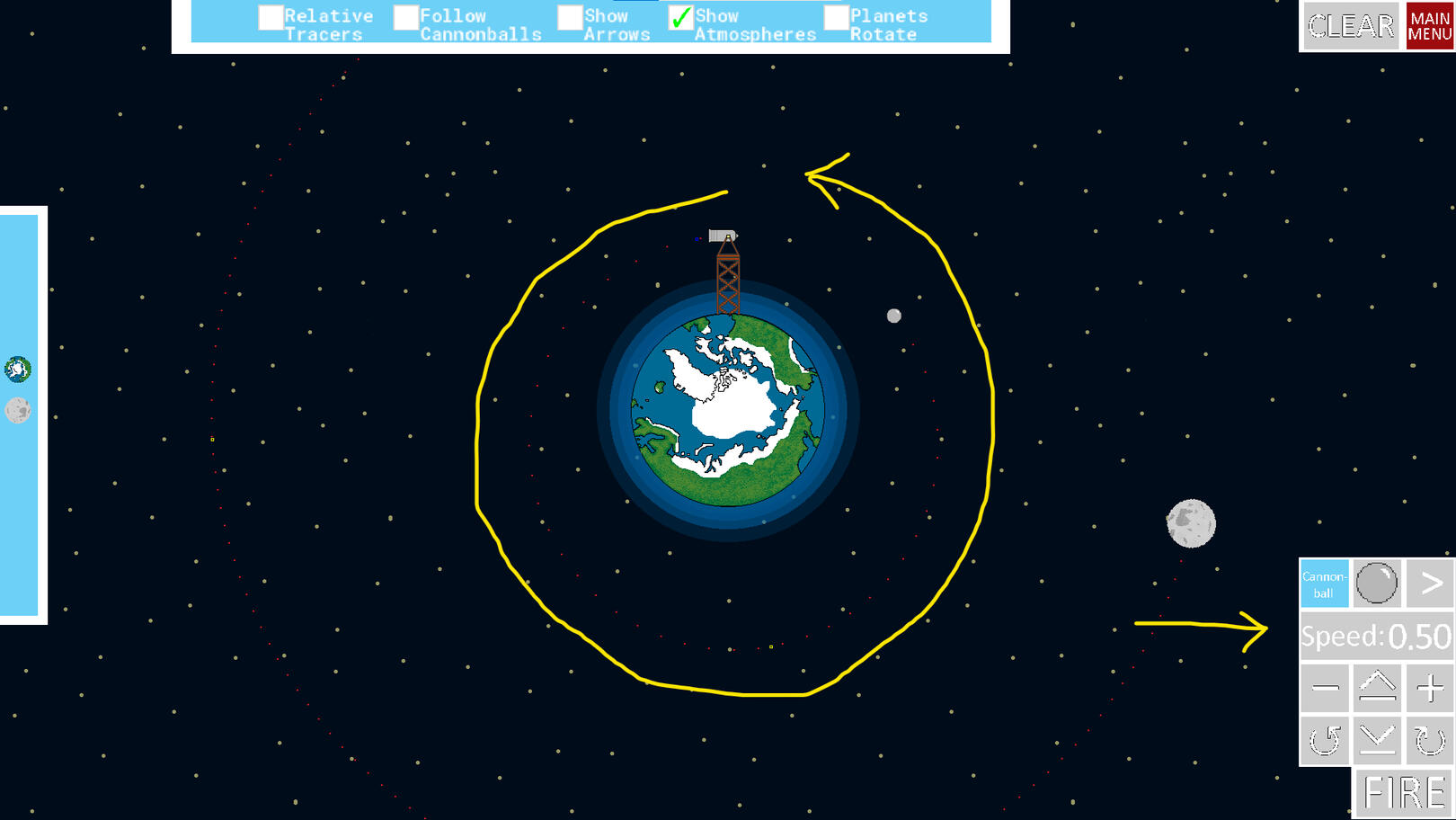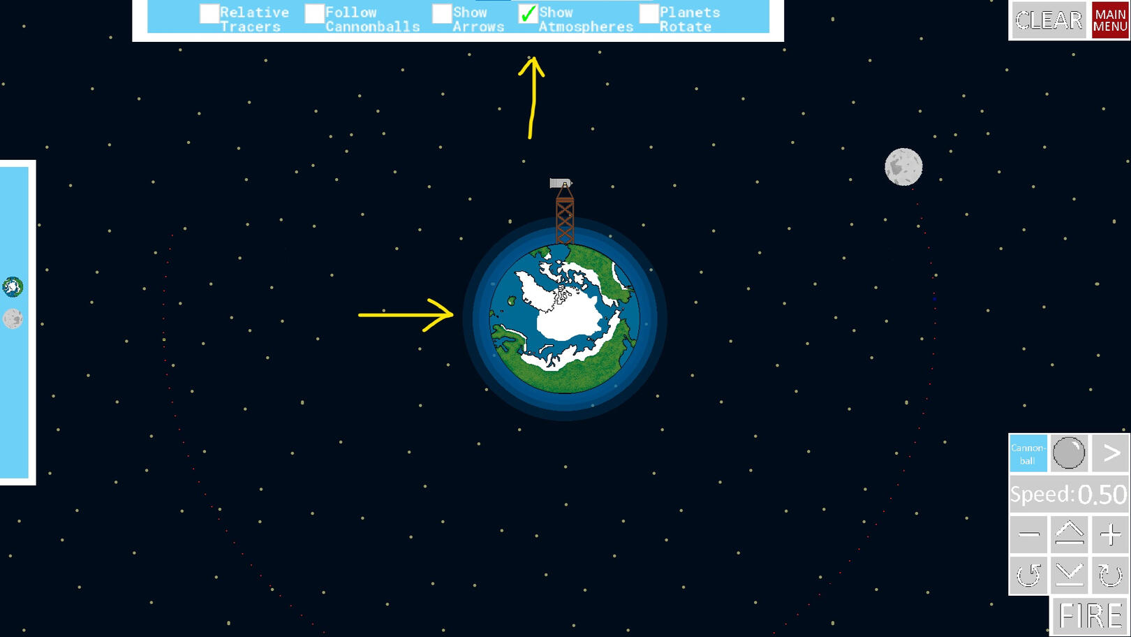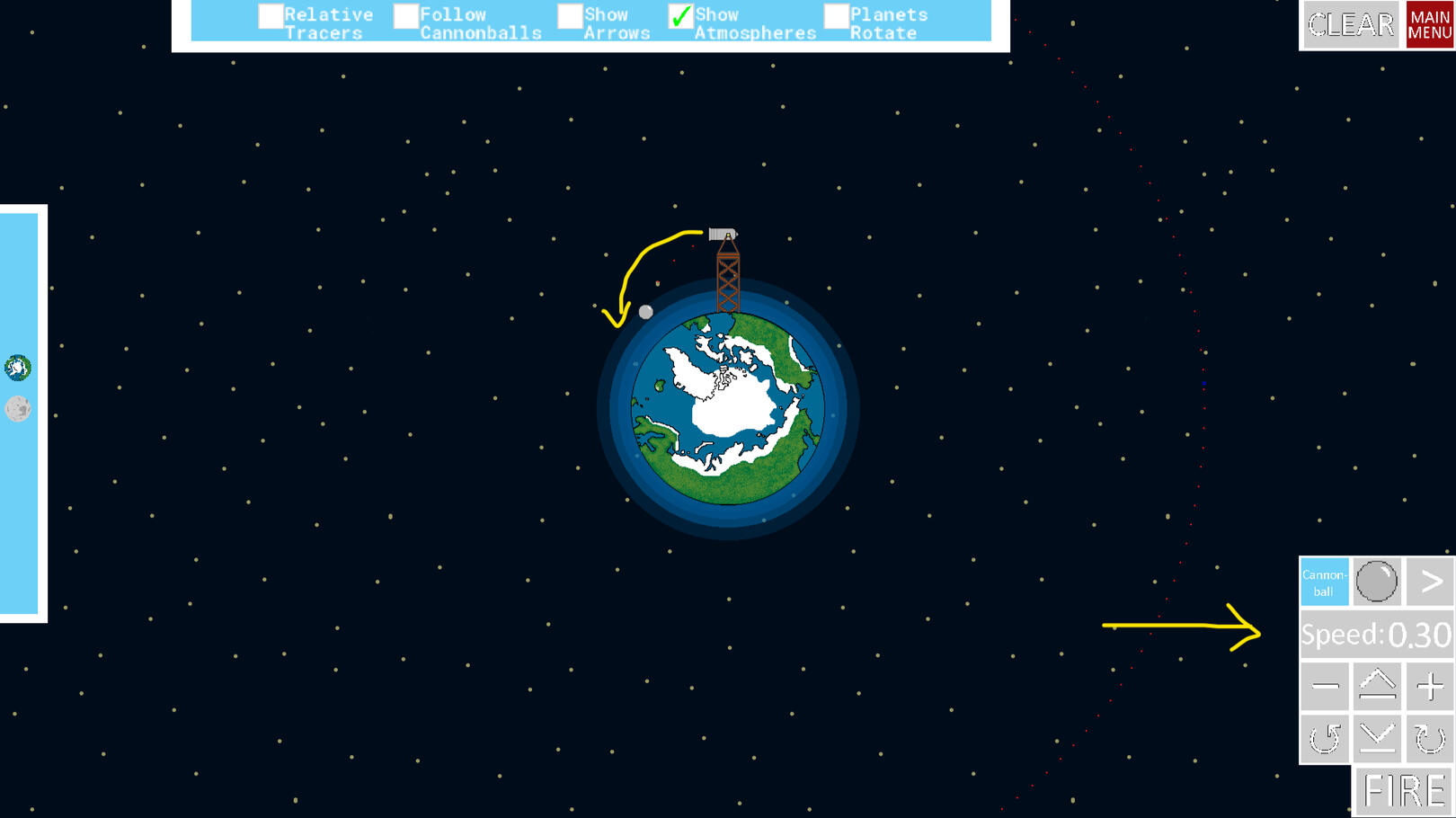 1. Try aiming the cannon sideways off the planet, not up or down. Raise the altitude of the cannon using the onscreen controls, or the W key or Up arrow on your keyboard.